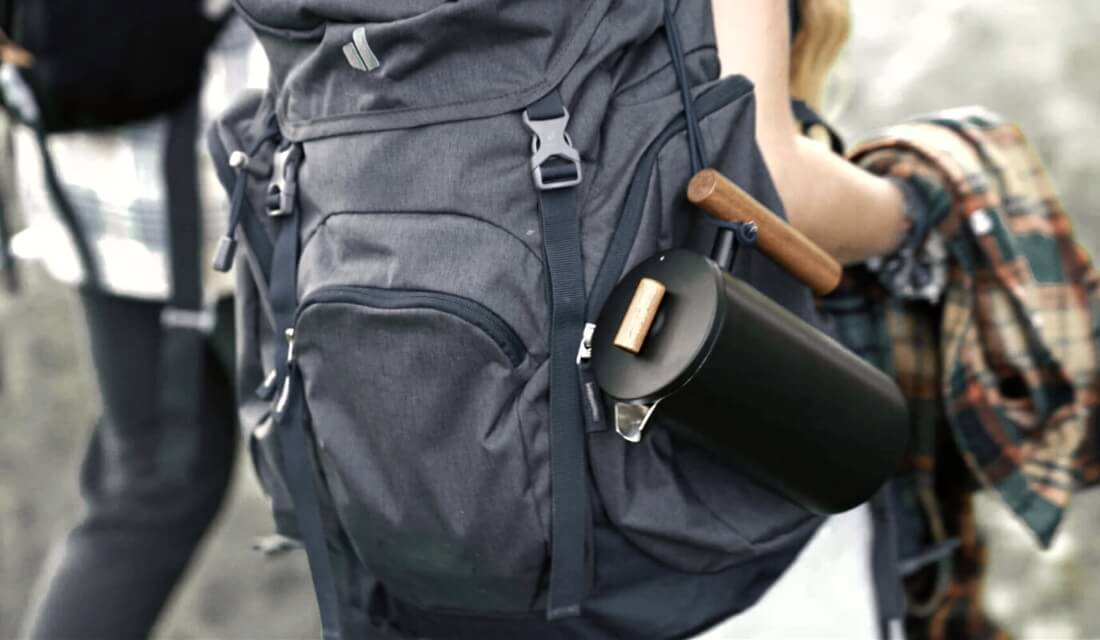 Unsere manuelle Kaffeemühle und die French Press nehmen dir fast keinen Platz im Rucksack und sind dabei noch richtig leicht.