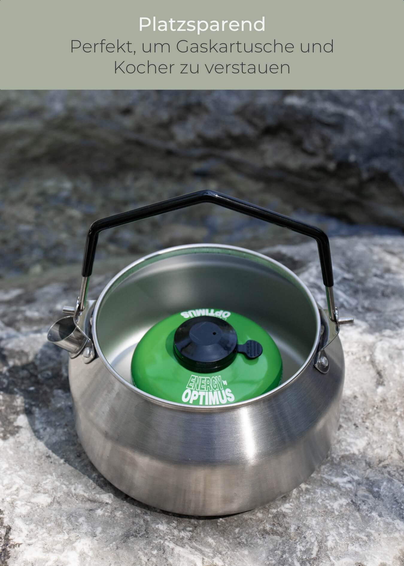 ✔️ Platzsparend: Dank intelligenter Bauweise mit großer Öffnung, um Gaskartusche sowie Mini-Kocher zu verstauen